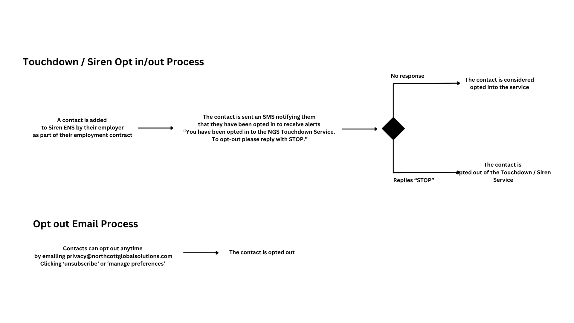 • Touchdown: Opt-In confirmation managed via Client HR or registration portal; NGS requires evidence of consent prior to activation.